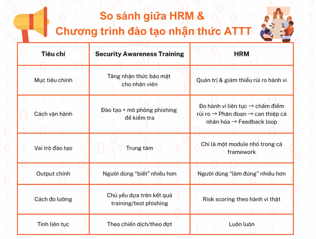HRM là cách tiếp cận chiến lược dựa trên dữ liệu để xác định, đo được và giảm thiểu rủi ro đến từ hành vi con người trong an ninh mạng. Khác với security awareness training truyền thống chỉ dừng ở việc “nhắc nhở hoặc cảnh báo”, HRM có cách tiếp cận xa hơn, giúp tổ chức thật sự đo được, quản lý được và giảm rủi ro mạng như một chỉ số vận hành có thể quản trị được.